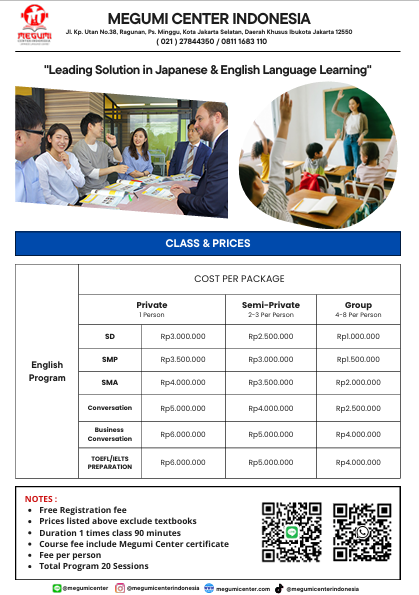 Megumi Center adalah solusi tepat untuk belajar bahasa Jepang. Para Pengajar kami adalah guru yang sudah berpengalaman dalam bidang pengajaran bahasa Jepang dan sudah pernah tinggal di Jepang, sehingga kultur bahasa yang di ajarkan tidak jauh berbeda dengan penutur aslinya. Selengkapnya>>