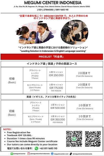 Kami menyediakan jasa Kursus Privat bahasa Jepang dan jasa pengajaran Bahasa Indonesia untuk para expatriate dari Jepang yang tinggal di Jakarta dan sekitarnya.
